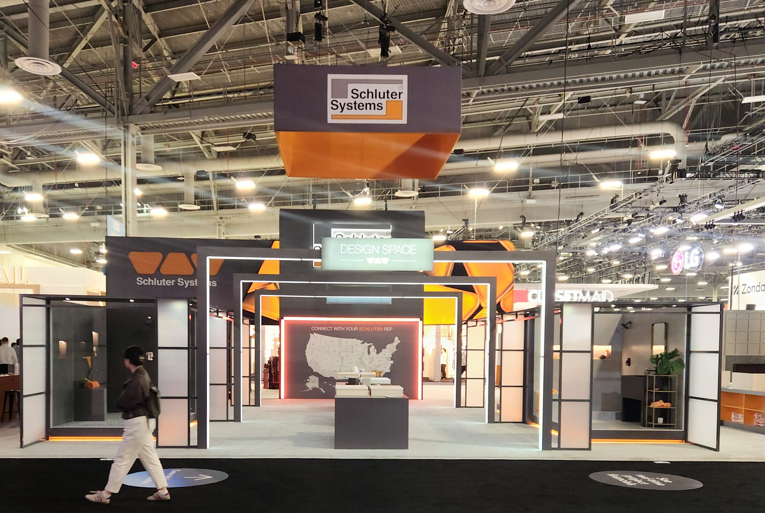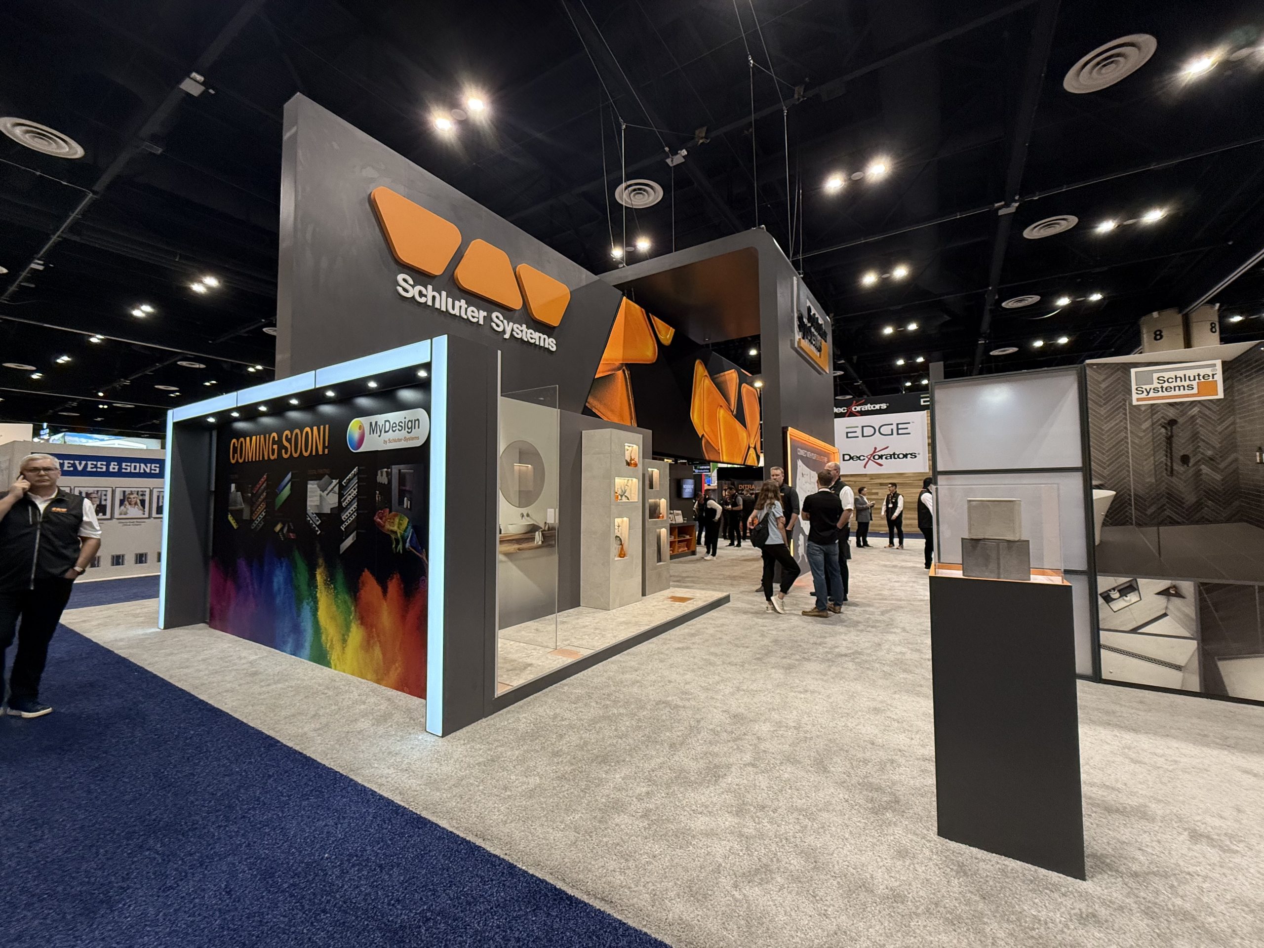 Grâce à des murs vidéo immersifs, des présentoirs produits dynamiques et une grande équipe de professionnels sur place, Schluter crée constamment une expérience puissante et professionnelle sur le plancher d’exposition.